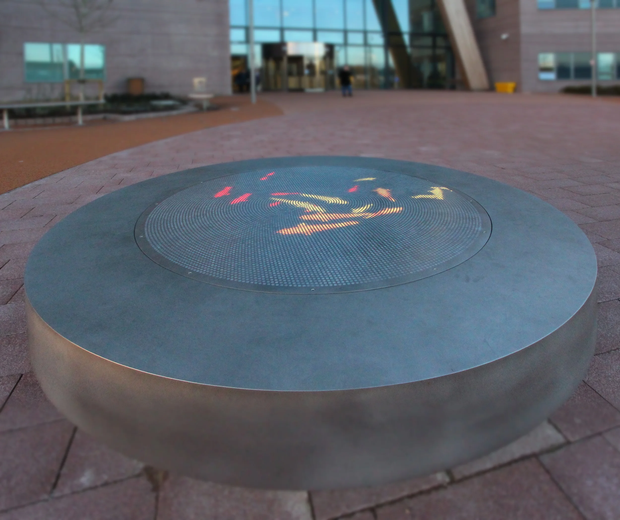 Digital Pond is an interactive sculpture and digital water feature developed though a series of workshops with the Children and Young People's Design Group at Alder Hey Children's Hospital. Large digital koi carp are attracted toward children sitting around the pool, while shoals of smaller fish swim away, creating continually changing responsive patterns of light that create a welcome distraction for visitors. The laser-cut stainless steel surface is populated with acrylic lenses above a completely bespoke radially array LED display.