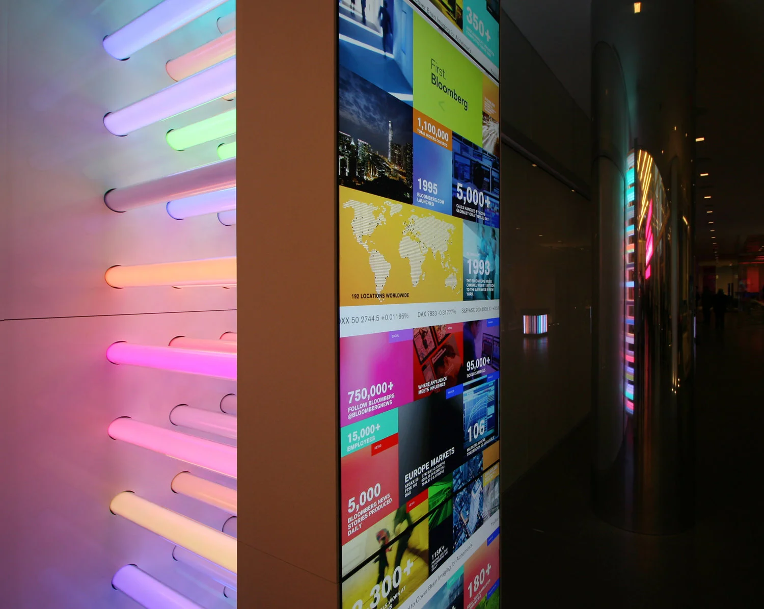 The Visitor Experience Installations are pieces of digital furniture designed for the entrance of Bloomberg’s New York Office. Two unique experiences create an engaging first impression and invite visitors to tap into the world of Bloomberg’s living network. Data appears to emerge from the fabric of the building itself through an array of colour-changing rods into a vertical patchwork surface of dynamic information, insights and images that illuminate, animate and colour the context of the New York office.