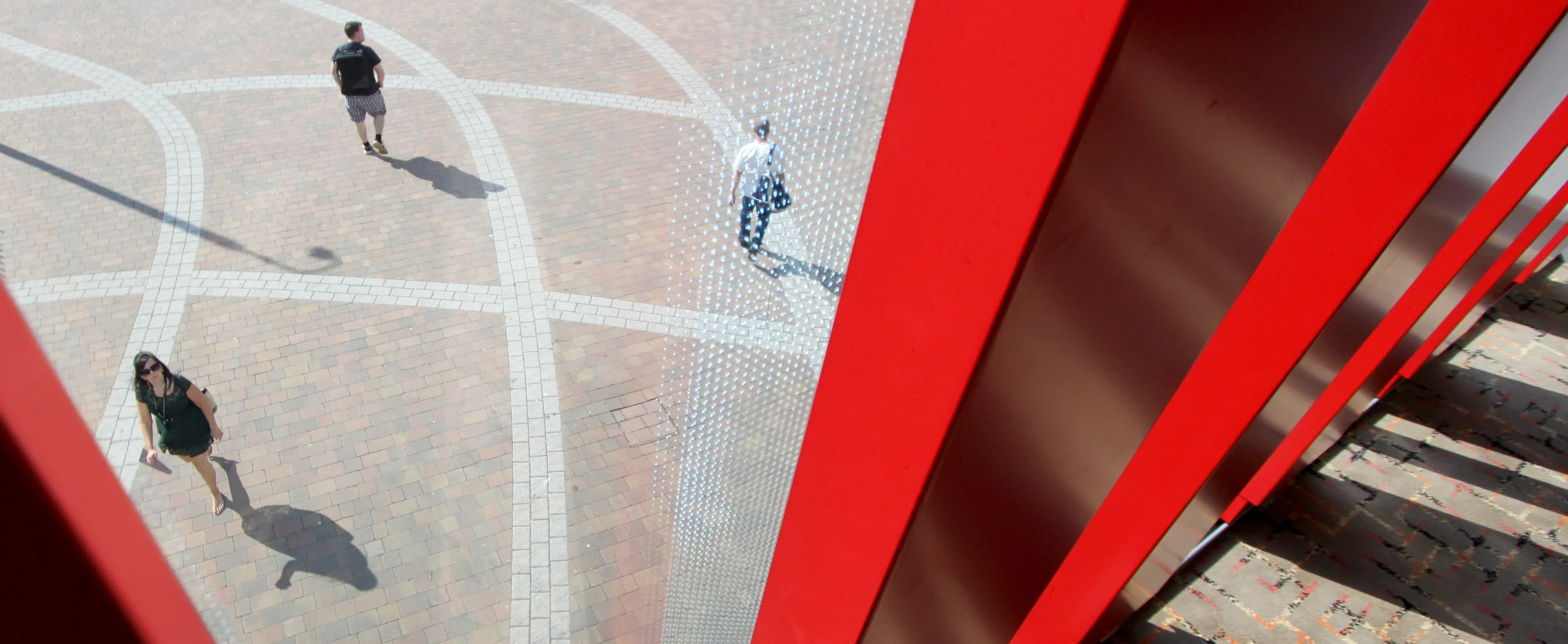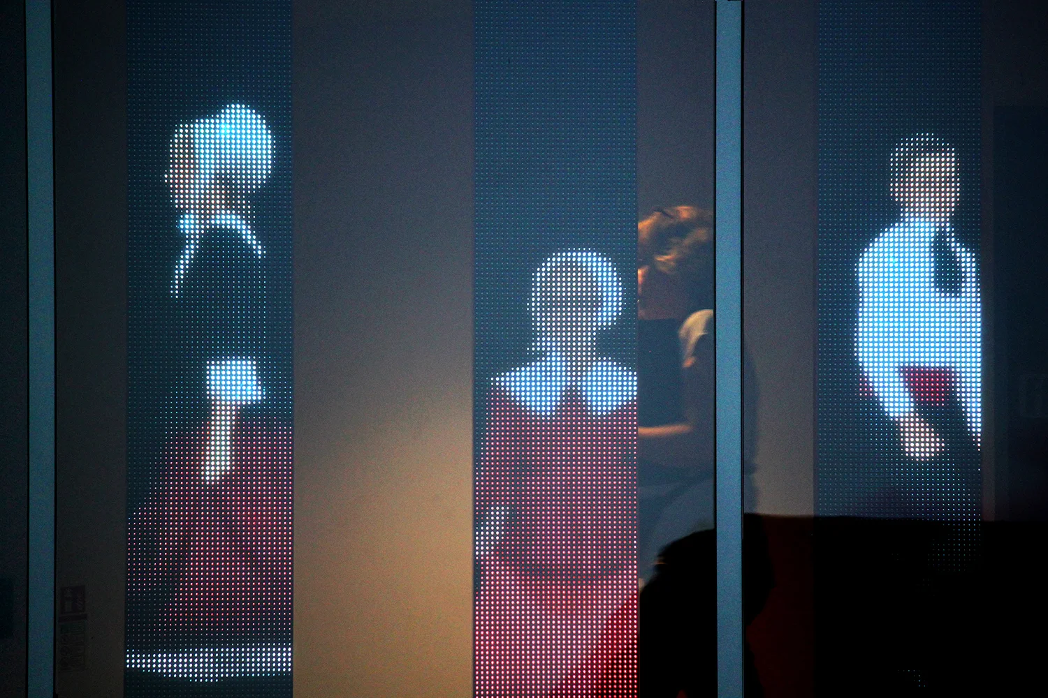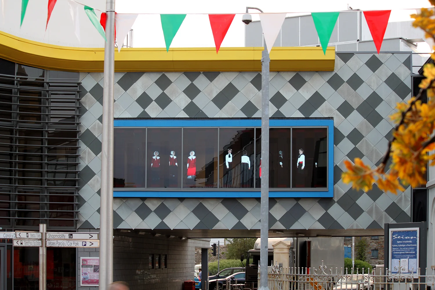 Audience is a site-specific public artwork that connects the vibrant community of Ffwrnes Theatre with the town of Llanelli in Wales. When activity is detected below, a crowd of virtual characters appear in an elevated panoramic window. When more people gather below, more virtual performers appear in the window. The virtual characters can be understood as performers, or as an audience watching everyday performances below. The studio worked with the local community and local filmmaker Tom Gripper to create the characters, filming participants in the theatre’s Stepni Studio. The groups who took part include Ysgol Heol Goffa, Ysgol Dewi Sant, Coleg Sir Gar, SA15 Stage School, Y Ffwrnes staff and visitors. The artwork included the design, fabrication and installation of the bespoke moving image display. Twelve sliding video panels occupy a panoramic window in the Y Ffwrnes Theatre in Llanelli town centre. The panels can be configured as a continuous broken landscape image or six portrait displays.