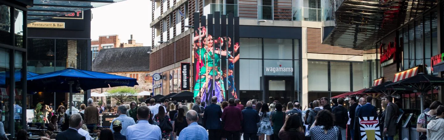 The first specially commissioned moving image artwork for The Beacons sculpture, Portraits is a moving image portrait of the people of Leicester. 160 people were invited to be filmed for 60 seconds though 360 degrees, at the city’s Curve Theatre. From afar the rotating portraits tower over St Peters Square like giant moving statues. Up-close the participant’s short performance, their movement and clothing illuminates, animates and colours the public space around it.