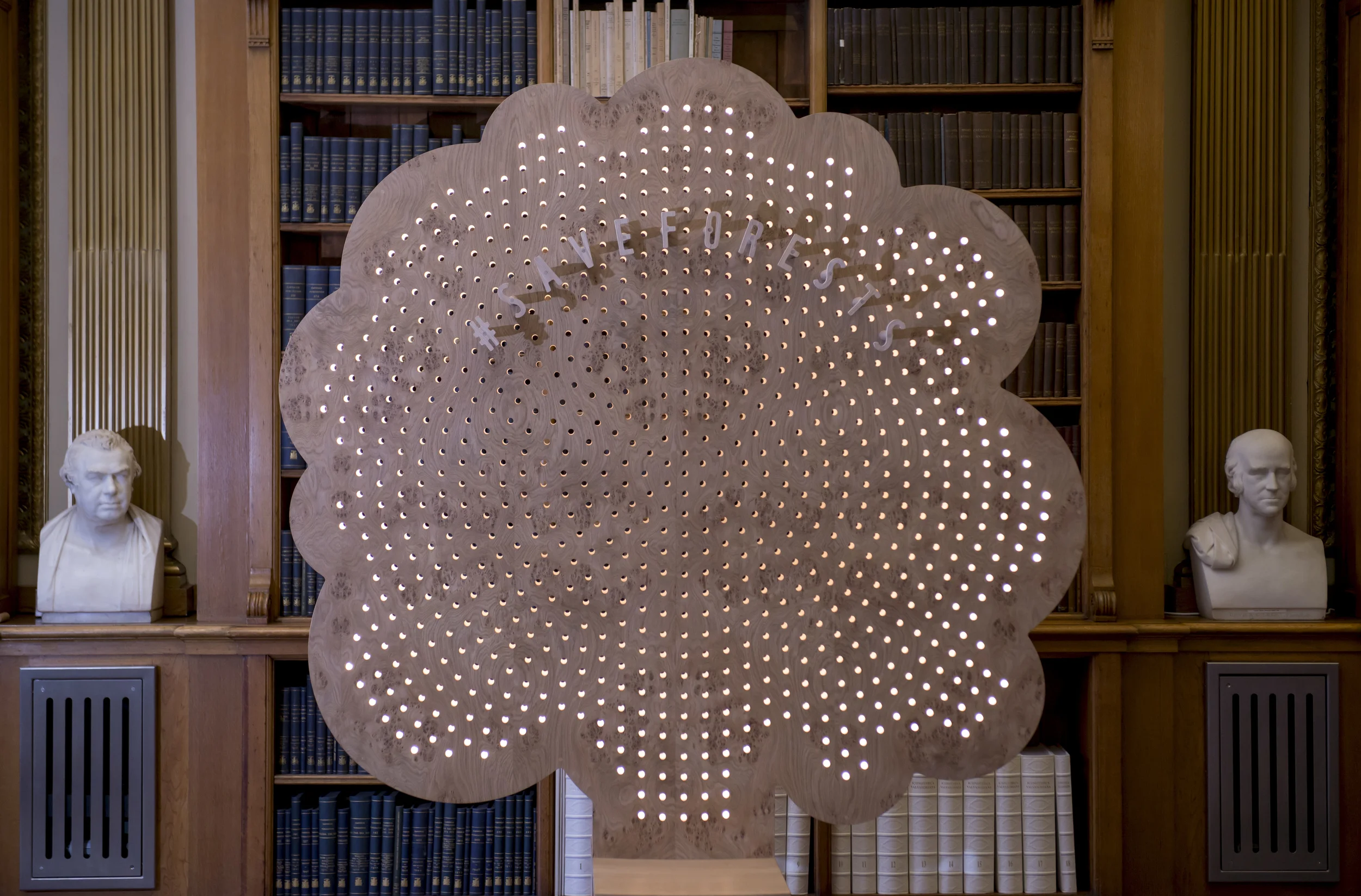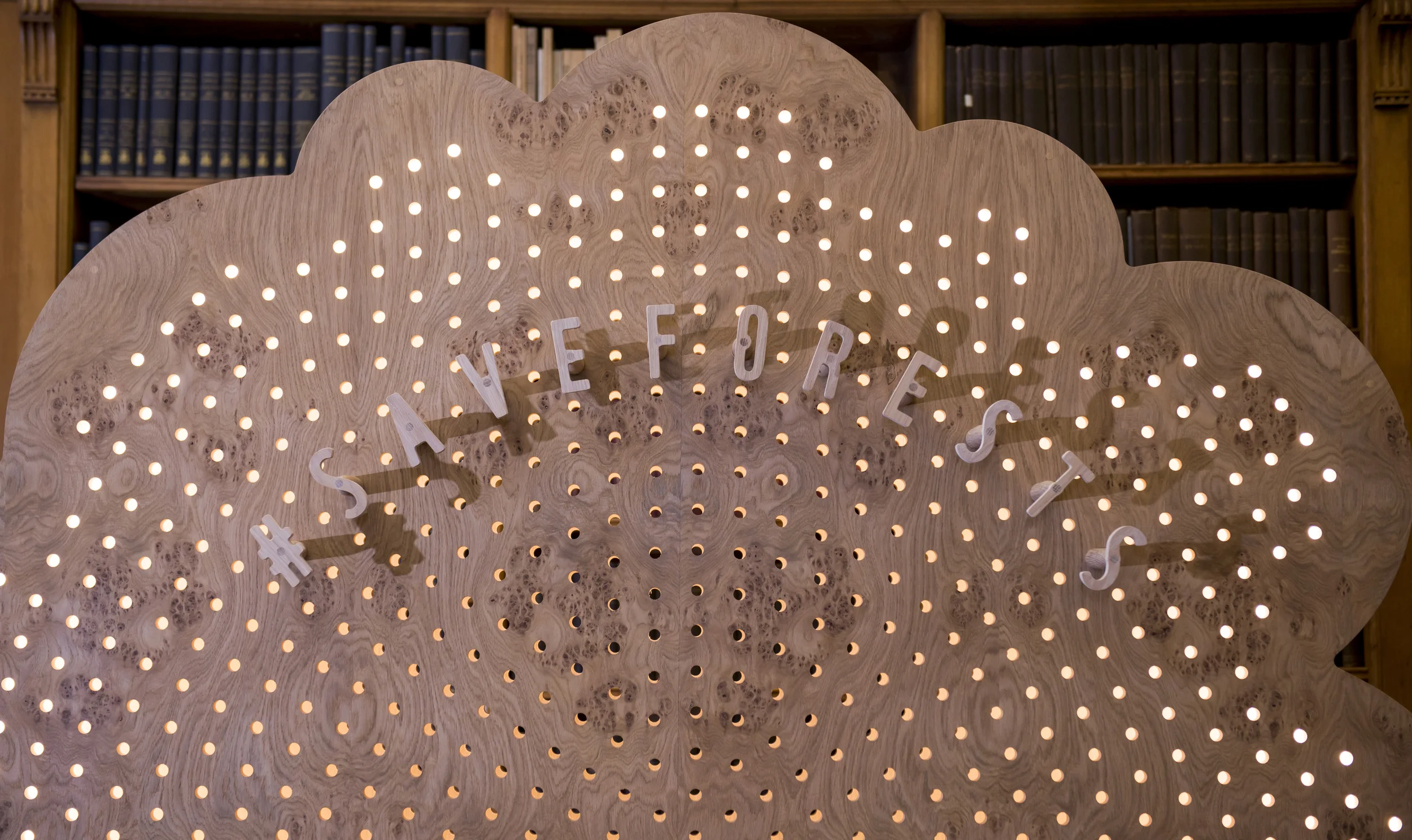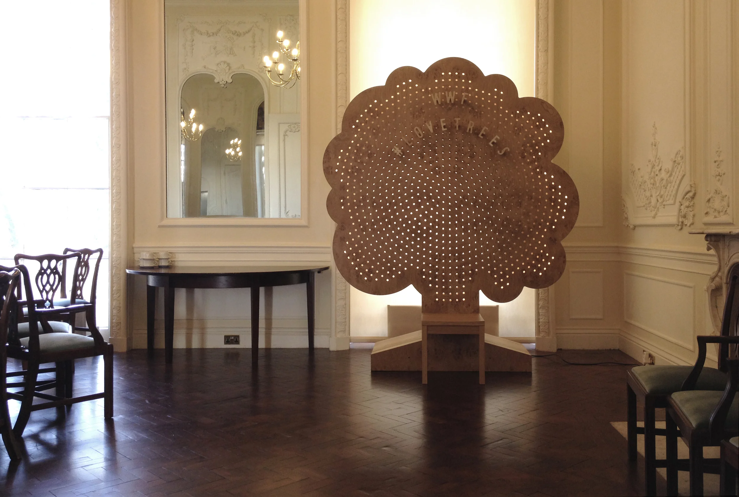 The ‘Sustainabilitree' is a campaign board and a piece of furniture. A recognisable, playful tree icon appears to be very natural and very man-made. The digitally cut and hand crafted piece encourages physical and haptic interaction with timber, the very subject of the WWF Forest Campaign. The campaign aims to cut out the illegal and unsustainable trade in timber and timber products in the UK. You can peg your pledge of support to the board or sit on the chair to pose for a picture. This FSC certified piece was fabricated by Benchmark. Internal lighting was supplied by OSRAM. Photographs by Richard Stonehouse of WWF-UK.